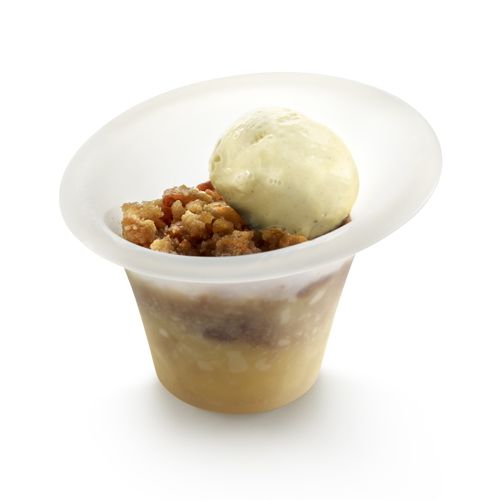Pela y corta las manzanas en dados pequeños y reparte en los moldes para microondas individuales. Añade dos cucharaditas de azúcar en cada molde. Mete las galletas en una bolsa de plástico, cierra y descarga toda tu furia sobre ellas con la ayuda de un rodillo. El resultado son unas migas finas que mezclarás con la mantequilla. Cubre las manzanas de cada molde con esas migas. Introduce cada molde por separado en el microondas, programa a máxima potencia y cocina durante 2 minutos. Sirve con helado de vainilla.